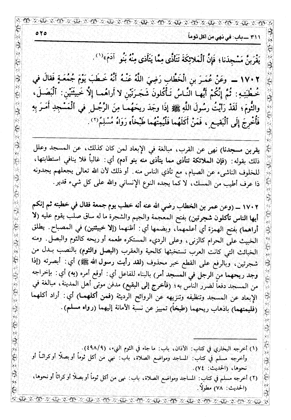 (¬2) أخرجه مسلم في كتاب: المساجد ومواضع الصلاة، باب: نهي من أكل ثوماً أو بصلاً أو كراثاً أو نحوها، (الحديث: 78) مطولاً.