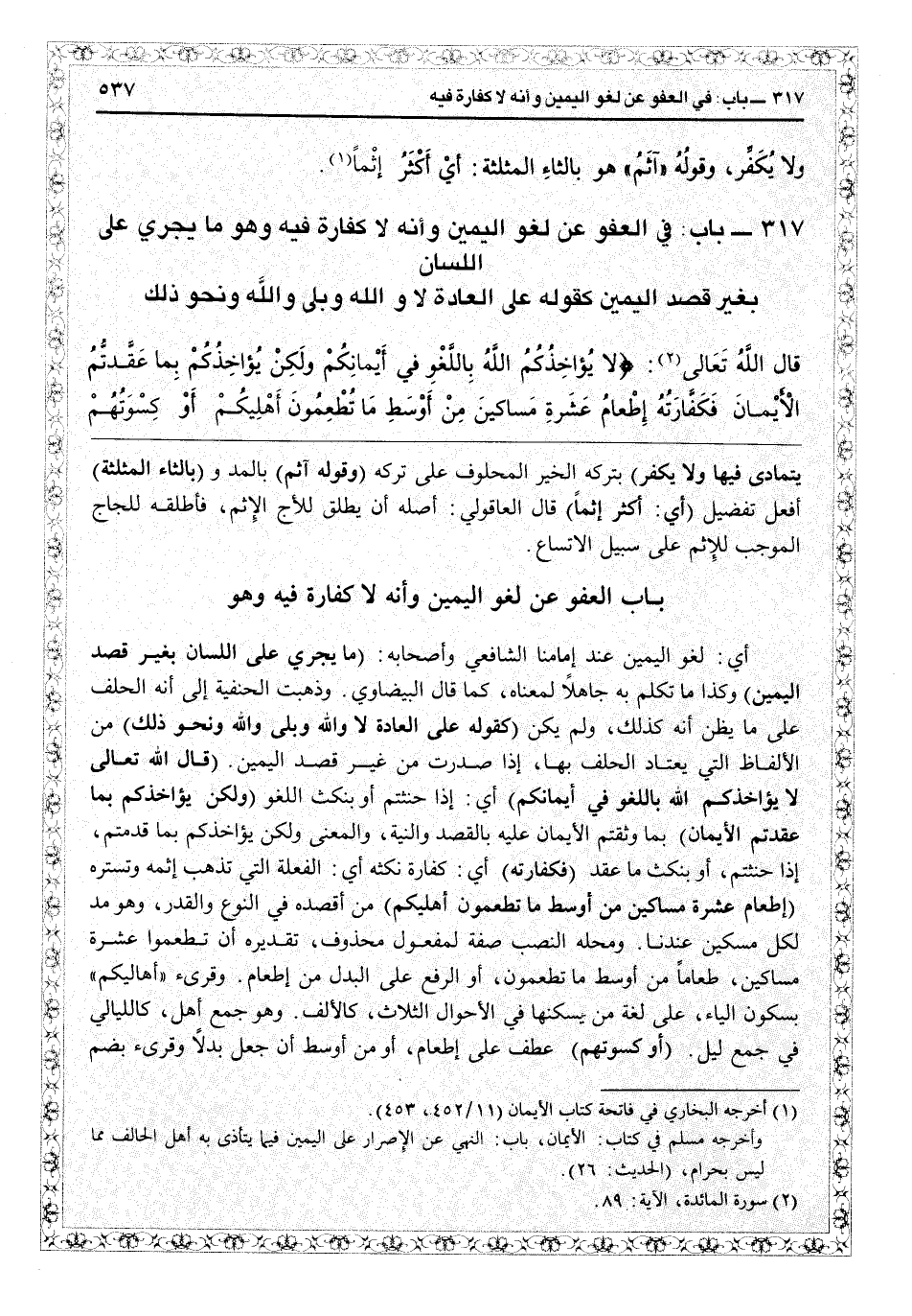 317- باب في العفو عن لغو اليمين وأنَّه لا كفارة فِيهِ، وَهُوَ مَا يجري عَلَى اللسان بغير قصد اليمين كقوله عَلَى العادة: لا والله، وبلى والله، ونحو ذَلِكَ