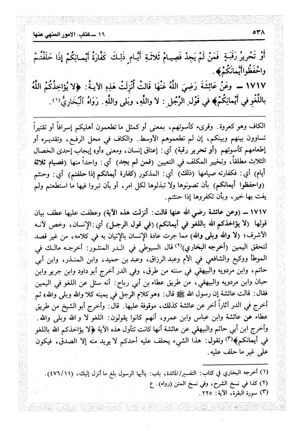 1717- وعن عائشة رَضِيَ اللهُ عنها، قالت: أُنْزِلَتْ هذِهِ الآية: (لاَ يُؤاخِذُكُمُ اللهُ بِاللَّغْوِ في أَيْمَانِكُمْ) في قَوْلِ الرَّجُلِ: لا واللهِ، وَبَلَى واللهِ. رواه البخاري (¬1) .