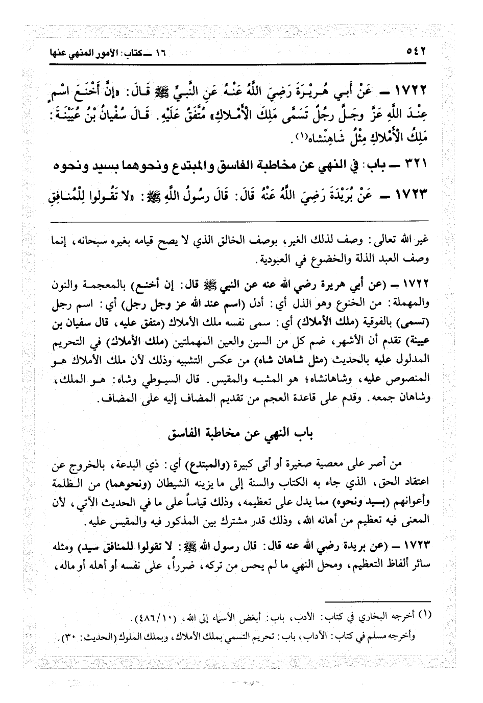 1723- (عن بريدة رضي الله عنه قال: قال رسول الله - صلى الله عليه وسلم -: لا تقولوا للمنافق سيد) ومثله سائر ألفاظ التعظيم، ومحل النهي ما لم يحس من تركه، ضرراً، على نفسه أو أهله أو ماله،
