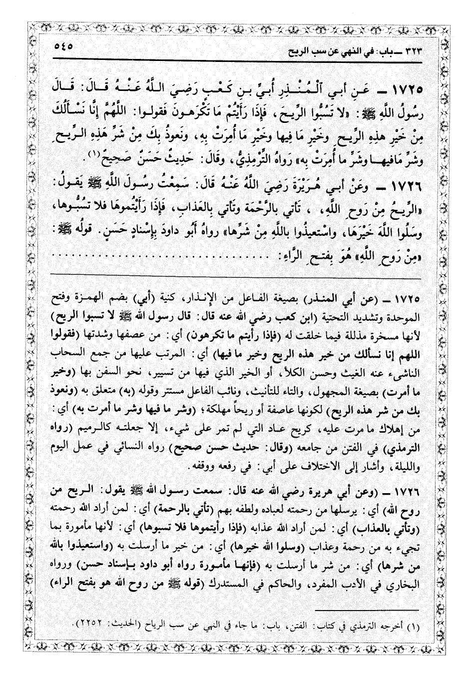 1725- عن أبي المنذِرِ أُبي بن كعب - رضي الله عنه - قال: قالَ رسولُ اللهِ - صلى الله عليه وسلم -: "لاَ تَسُبُّوا الرِّيحَ، فَإِذَا رَأَيْتُمْ مَا تَكْرَهُونَ، فَقُولُوا: اللَّهُمَّ إنَّا نَسْأَلُكَ مِنْ خَيْرِ هذِهِ الرِّيحِ وَخَيْرِ مَا فِيهَا وخَيْرِ مَا أُمِرَتْ بِهِ. وَنَعُوذُ بِكَ مِنْ شَرِّ هذِهِ الرِّيحِ وَشَرِّ مَا فِيهَا وَشَرِّ مَا أُمِرَتْ بِهِ". رواه الترمذي، وقال: "حديث حسن صحيح" (¬1) .