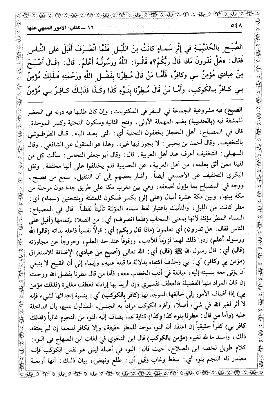 الصُّبْحِ بِالحُدَيْبِيَّةِ في إثْرِ سَمَاءٍ كَانَتْ مِنَ اللَّيْلِ، فَلَمَّا انْصَرَفَ أقْبَلَ عَلَى النَّاسِ، فقالَ: "هَلْ تَدْرُونَ مَاذَا قالَ رَبُّكُمْ؟ " قالُوا: اللهُ وَرَسُولُهُ أعْلَمُ. قال: "قالَ: أصْبَحَ مِنْ عِبَادِي مُؤْمِنٌ بِي، وَكَافِرٌ، فَأَمَّا مَنْ قَالَ: مُطِرْنَا بِفَضْلِ اللهِ وَرَحْمَتِهِ، فَذلِكَ مُؤْمِنٌ بِي كَافِرٌ بِالكَوْكَبِ، وأَما مَنْ قَالَ مُطِرْنَا بِنَوءِ كَذَا وَكَذَا، فَذلكَ كَافِرٌ بِي مُؤْمِنٌ