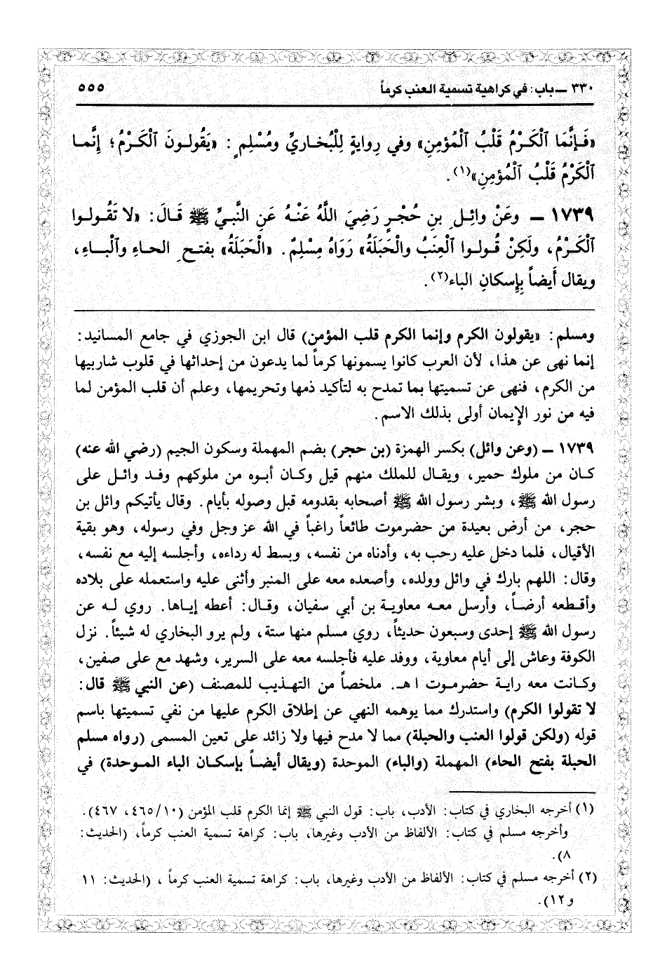 1739- وعن وائلِ بنِ حُجرٍ - رضي الله عنه -، عن النَّبيِّ - صلى الله عليه وسلم -، قال: "لاَ تَقُولُوا: الكَرْمُ، وَلكِنْ قُولُوا: العِنَبُ، والحَبَلَةُ". رواه مسلم.
