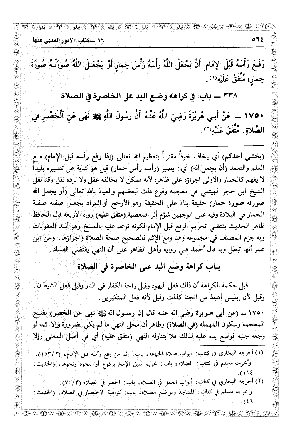 1750- عن أَبي هريرة - رضي الله عنه -: أنَّ رسولَ اللهِ - صلى الله عليه وسلم - نَهَى عن الخَصْرِ في الصَّلاَةِ. متفق عَلَيْهِ (¬2) .