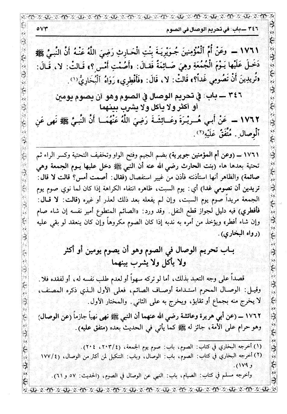 1762- (عن أبي هريرة وعائشة رضي الله عنهما أن النبي - صلى الله عليه وسلم - نهى نهياً جازماً (عن الوصال) وهو حرام على الأمة، جائز له - صلى الله عليه وسلم - كما يأتي في الحديث بعده (متفق عليه) .