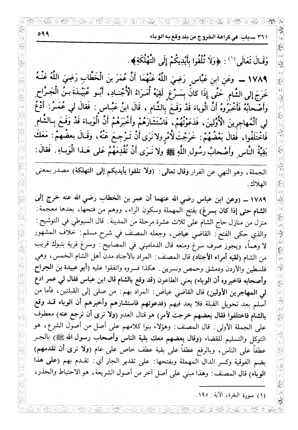 الجملة، وهو النهي عن الفرار وقال تعالى: (ولا تلقوا بأيديكم إلى التهلكة) مصدر بمعنى الهلاك. 1789- (وعن ابن عباس رضي الله عنهما أن عمر بن الخطاب رضي الله عنه خرج إلى الشام حتى إذا كان بسرغ) بفتح المهملة وسكون الراء، ووهم من فتحها، بعدها معجمة: منزل من منازل حاج الشام على ثلاث عشرة مرحلة من المدينة. قال السيوطي في التوشيح: والذي حكى الفتح: القاضي عياض، وجعله المصنف في شرح مسلم: خلاف المشهور لا وهماً، ويجوز صرف سرغ ومنعه قال الدماميني في المصابيح: وسرغ قرية بتبوك قريب من الشام (لقيه أمراء الأجناد) قال المصنف: المراد بالأجناد مدن أهل الشام الخمس، وهي فلسطين والأردن ودمشق وحمص ونسرين. هكذا فسروه واتفقوا عليه (أبو عبيدة بن الجراح وأصحابه فأخبروه أن الوباء) يعني الطاعون (قد وقع بالشام قال ابن عباس فقال لي عمر ادع لي المهاجرين الأولين) قال القاضي عياض: المراد بهم: من صلى إلى القبلتين، فأما من أسلم بعد تحويل القبلة فلا يعد فيهم (فدعوتهم فاستشارهم وأخبرهم أن الوباء قد وقع بالشام فاختلفوا فقال بعضهم خرجت لأمر) هو قتال العدو (ولا نرى أن نرجع عنه) معطوف على الجملة الأولى. قال المصنف: وهؤلاء بنوا كلامهم على أصل من أصول الشرع، هو التوكل والتسليم للقضاء (وقال بعضهم معك بقية الناس وأصحاب رسول الله - صلى الله عليه وسلم -) بالجر عطفاً على الناس، وبالرفع عطفاً على بقية عطف خاص على عام (ولا نرى أن تقدمهم) بضم الفوقية وكسر الدال المهملة وبفتحها: على تقدير الجار أي: تقدم بهم (على هذا الوباء) قال المصنف وهذا مبني على أصل آخر من أصول الشريعة، هو الاحتياط والحذر،