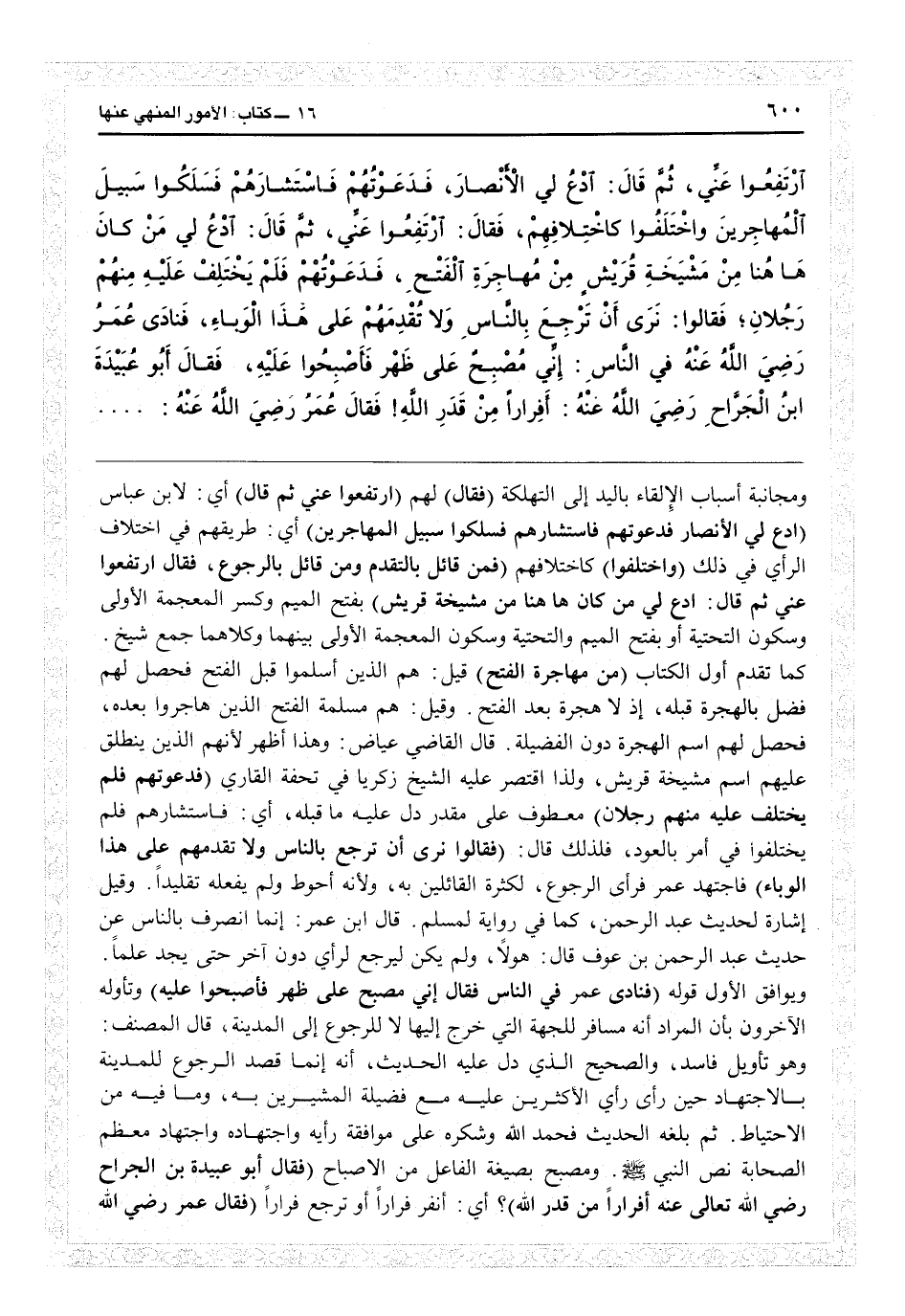 ارْتَفِعُوا عَنِّي. ثُمَّ قَالَ: ادْعُ لِي الأَنْصَارَ، فَدَعَوْتُهُمْ، فَاسْتَشَارَهُمْ، فَسَلَكُوا سَبيلَ المُهَاجِرينَ، وَاخْتَلَفُوا كاخْتِلاَفِهِمْ، فقال: ارْتَفِعُوا عَنِّي. ثُمَّ قَالَ: ادْعُ لِي مَنْ كَانَ هاهُنَا مِنْ مَشْيَخَةِ قُريشٍ مِنْ مُهَاجِرَةِ الفَتْحِ، فَدَعَوْتُهُمْ، فَلَمْ يَخْتَلِفْ عَلَيْهِ مِنْهُمْ رَجُلاَنِ، فَقَالُوا: نَرَى أنْ تَرْجِعَ بِالنَّاسِ، وَلاَ تُقْدِمَهُمْ عَلَى هَذَا الوَبَاءِ، فَنَادَى عُمَرُ - رضي الله عنه - في النَّاسِ: إنِّي مُصَبحٌ عَلَى ظَهْرٍ، فَأَصْبِحُوا عليْهِ، فقال أبو عبيدة بن الجراح - رضي الله عنه -: أفِراراً مِنْ قَدَرِ الله؟ فقالَ عُمرُ - رضي الله عنه -: