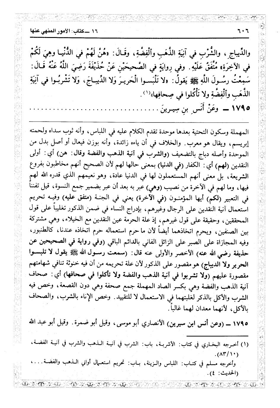 وفي رواية في الصحيحين عن حُذيْفَةَ - رضي الله عنه -: سَمِعْتُ رسولَ الله - صلى الله عليه وسلم - يقولُ: "لاَ تَلْبسُوا الحَرِيرَ وَلاَ الدِّيبَاجَ، وَلاَ تَشْرَبُوا فِي آنِيَةِ الذَّهَبِ وَالفِضَّةِ وَلاَ تَأكُلُوا في صِحَافِهَا" (¬1) .