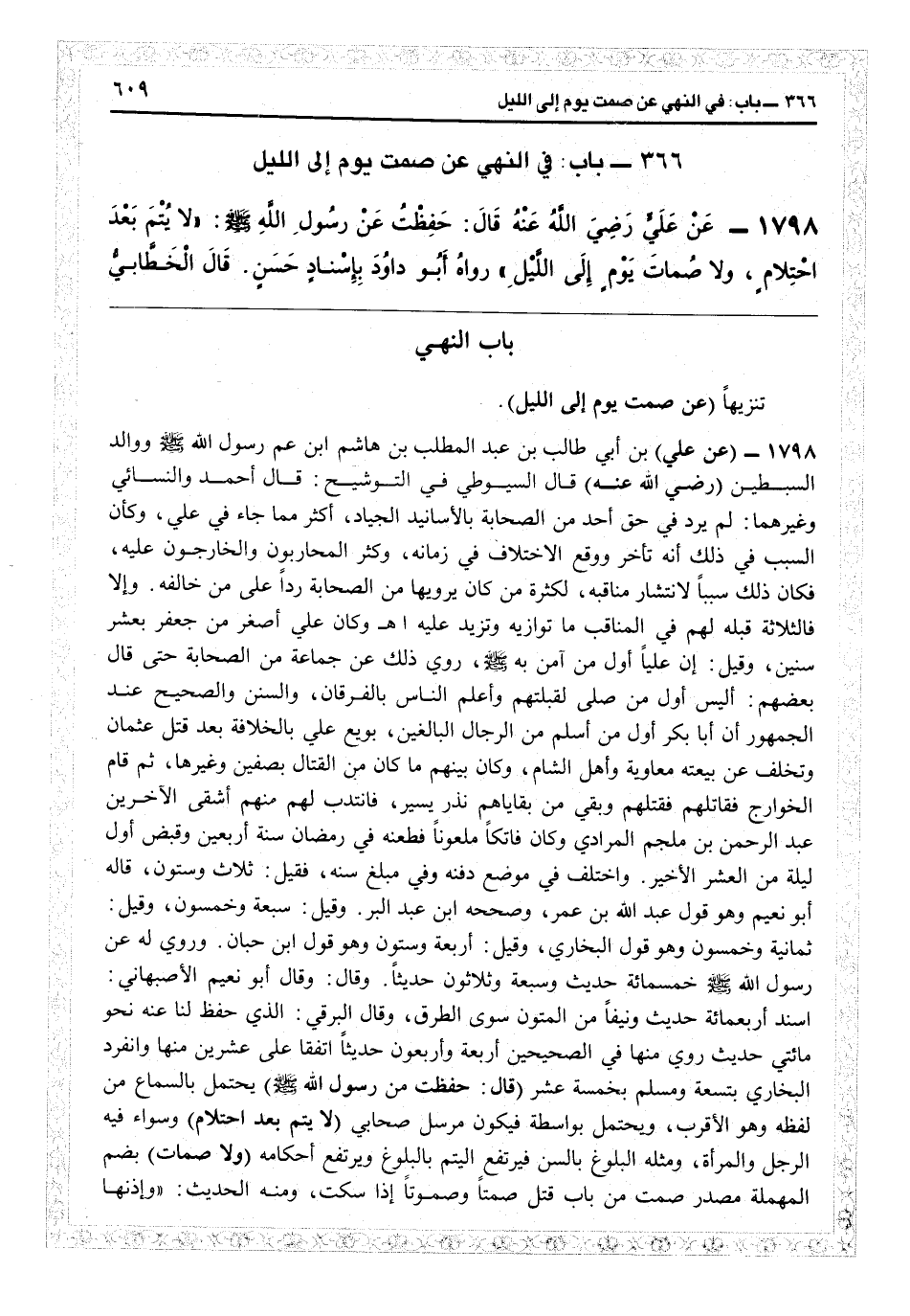 1798- عن عليٍّ - رضي الله عنه - قَالَ: حَفِظْتُ عَنْ رَسُولِ اللهِ - صلى الله عليه وسلم -: "لاَ يُتْمَ بَعْدَ احْتِلاَمٍ، وَلاَ صُمَاتَ يَومٍ إِلَى اللَّيْلِ". رواه أَبُو داود بإسناد حسن. قَالَ الخَطَّابِيُ