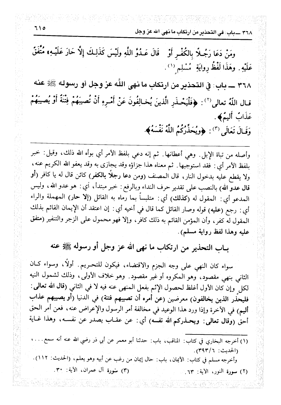368- باب في التحذير من ارتكاب ما نهى الله - عز وجل - أَو رسوله - صلى الله عليه وسلم - عنه قال الله تعالى (¬2) : (فَلْيَحْذَرِ الَّذِينَ يُخَالِفُونَ عَنْ أمْرِهِ أنْ تُصِيبَهُمْ فِتْنَةٌ أَوْ يُصِيبَهُمْ عَذَابٌ أَلِيمٌ) .