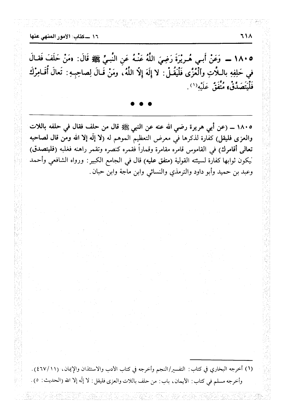 1805- وعن أبي هريرة - رضي الله عنه -، عن النبيِّ - صلى الله عليه وسلم - قال: "مَنْ حَلَفَ فَقَالَ في حَلفِهِ: بِاللاَّتِ وَالعُزَّى، فَلْيَقُلْ: لاَ إلَهَ إلاَّ اللهُ، وَمَنْ قَالَ لِصَاحِبهِ: تَعَالَ أُقَامِركَ فَلْيَتَصَدَّقْ". متفق عليه (¬1) .