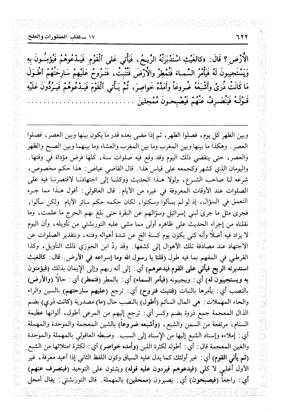 واليومان الذي كشهر وكجمعه على قياس هذا. قال القاضي عياض: هذا حكم مخصوص، شرعه لنا صاحب الشرع، ولولا هذا الحديث ووكلنا إلى اجتهادنا لاقتصرنا فيه على الصلوات عند الأوقات المعروفة في غيره من الأيام. قال العاقولي: أقول هذا مما جره التعمق في السؤال، إذ لو لم يسألوا وسكتوا، لكان حكمه حكم سائر الأيام ولكن سألوا، فجرى مثل ما جرى لبني إسرائيل وسؤالهم عن البقرة حتى بلغ بهم الحرج ما علمت، وما نقلناه من إجراء الحديث على ظاهره أولى مما مشى عليه التوربشتي من تأويله، وأن اليوم لا يزاد فيه أصلاً وأنه كنى يكون يوم كسنة الخ عن شدة أهواله وفتنه، وبتقدير الصلوات عن الاجتهاد عند مصادفة تلك الأهوال إلى كشفها. وقد ردّ ابن الجوزي ذلك التأويل، وكذا القرطبي في المفهم بما فيه طول (قلنا يا رسول الله وما إسراعه في الأرض. قال: كالغيث استدبرته الريح فيأتي على القوم فيدعوهم) أي: إلى أنه ربهم وإلى الإِيمان بذلك (فيؤمنون به ويستجيبون له) أي: ويجيبونه (فيأمر السماء) أي: بالمطر (فتمطر) أي: حالاً (والأرض) بالنصب أي: يأمرها بالنبات (فتنبت فتروح) أي: ترجع (عليهم سارحتهم) بالسين والراء والحاء المهملات: هي المال السائم (أطول) بالنصب حال (ما) مصدرية (كانت ذري) بضم الذال المعجمة جمع ذروة بضم وكسر أي: ترجع إليهم من المرعى أطول، ألوانها عظيمة السنام، مرتفعة من السمن والشبع، (وأشبعه ضروعاً) بالشين المعجمة والموحدة والمهملة أي: إملاءه وإسناد الشبع إليها من الإِسناد إلى السبب. وضبطه العاقولي بالمهملة والموحدة والغين المعجمة قال: أي: أطوله لكثرة اللبن (وأمده خواصر) أي: لكثرة امتلائها من الشبع (ثم يأتي القوم) أي: غير أولئك كما يدل عليه السياق وكون اللفظ الثاني إذا أعيد معرفة، غير الأول أغلبي لا كلي (فيدعوهم فيردون عليه قوله) ويثبتون على التوحد (فينصرف عنهم) أي: راجعاً (فيصبحون) أي: يصيرون (ممحلين) بالمهملة. قال التوربشتي: يقال أمحل