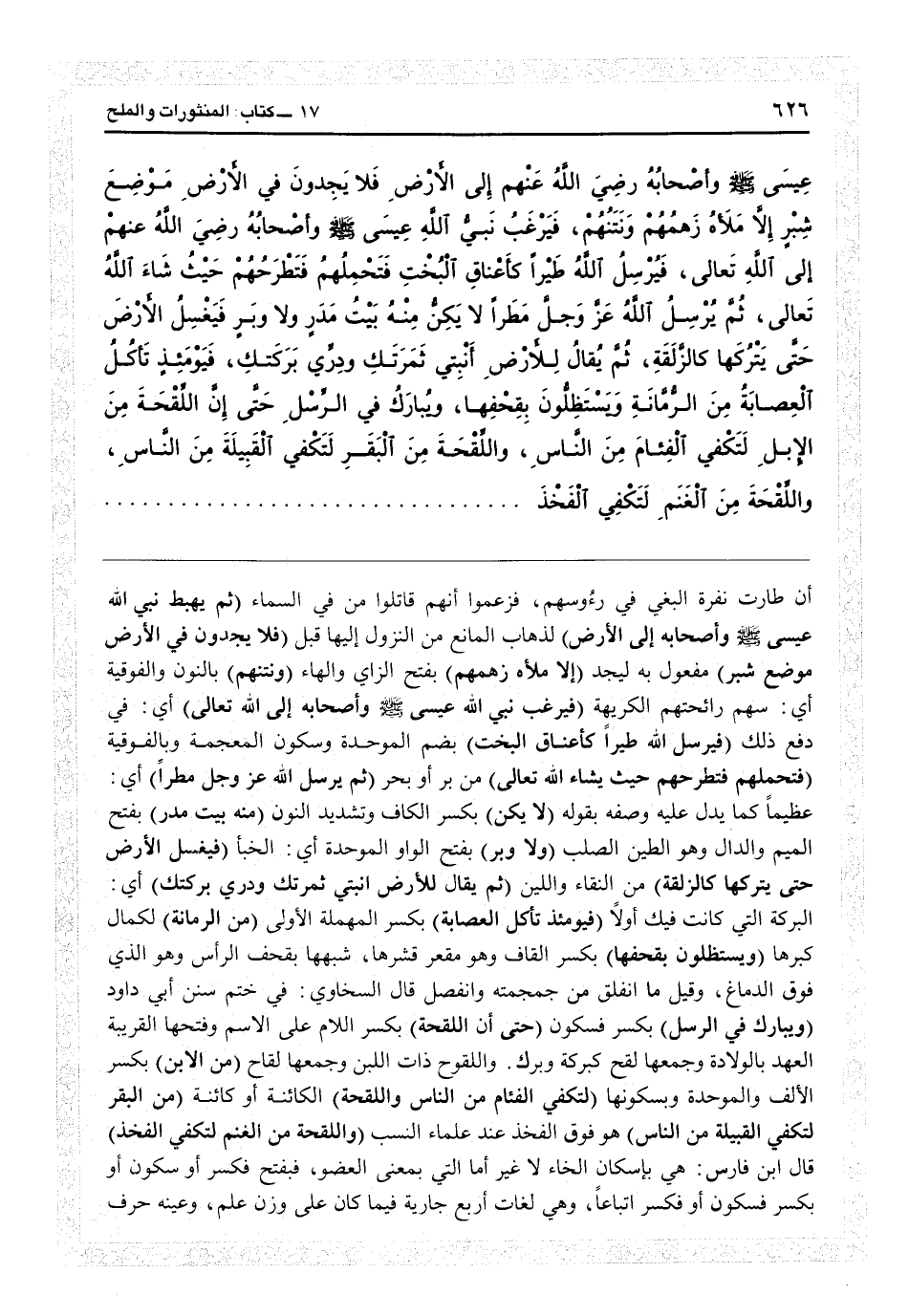 عِيسَى - صلى الله عليه وسلم - وأصْحَابُهُ - رضي الله عنهم - إلى اللهِ تَعَالَى، فَيُرْسِلُ اللهُ تَعَالَى عَلَيْهِمُ النَّغَفَ في رِقَابِهِمْ، فَيُصْبِحُونَ فَرْسَى كَمَوْتِ نَفْسٍ وَاحِدَةٍ، ثُمَّ يَهْبِطُ نَبِيُّ اللهِ عِيسَى - صلى الله عليه وسلم -، وأصْحَابُهُ - رضي الله عنهم - إلى الأرْضِ، فَلاَ يَجِدُونَ في الأرْضِ مَوْضِعَ شِبْرٍ إلاَّ مَلأَهُ زَهَمُهُمْ وَنَتَنُهُمْ، فَيَرْغَبُ نَبِيُّ اللهِ عِيسَى - صلى الله عليه وسلم - وَأصْحَابُهُ - رضي الله عنهم - إلى اللهِ تَعَالَى، فَيُرْسِلُ اللهُ تَعَالَى طَيْراً كَأَعْنَاقِ البُخْتِ، فَتَحْمِلُهُمْ، فَتَطْرَحُهُمْ حَيثُ شَاءَ اللهُ، ثُمَّ يُرْسِلُ اللهُ - عز وجل - مَطَراً لاَ يُكِنُّ مِنهُ بَيْتُ مَدَرٍ وَلاَ وَبَرٍ، فَيَغْسِلُ الأرْضَ حَتَّى يَتْرُكَهَا كَالزَّلَقَةِ، ثُمَّ يُقَالُ للأرْضِ: أنْبِتي ثَمَرتكِ، وَرُدِّي بَرَكَتَكِ، فَيَوْمَئِذٍ تَأكُلُ العِصَابَةُ مِنَ الرُّمَّانَةِ، وَيَسْتَظِلُّونَ بِقَحْفِهَا، وَيُبَارَكُ فِي الرِّسْلِ حَتَّى أنَّ اللّقْحَةَ مِنَ الإِبِلِ لَتَكْفِي الفِئَامَ مِنَ النَّاسِ؛ وَاللِّقْحَةَ مِنَ البَقَرِ لَتَكْفِي القَبِيلَةَ مِنَ النَّاسِ، وَاللِّقْحَةَ مِنَ الغَنَمِ لَتَكْفِي الفَخِذَ