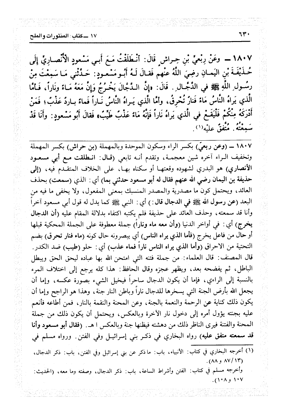 1807- وعن رِبعِيِّ بنِ حِرَاشٍ، قال: انطلقت مع أبي مسعود الأنصاري إلى حُذَيفَةَ بن اليمان - رضي الله عنهم -، فقال له أبو مسعود: حَدِّثْنِي ما سَمِعْتَ مِنْ رَسُولِ اللهِ - صلى الله عليه وسلم -، في الدَّجَّالِ، قال: "إنَّ الدَّجَّالَ يَخْرُجُ، وإنَّ مَعَهُ مَاءً وَنَاراً، فَأَمَّا الَّذِي يَرَاهُ النَّاسُ مَاءً فَنَارٌ تُحْرِقُ، وأمَّا الَّذِي يَرَاهُ النَّاسُ نَاراً، فَمَاءٌ بَارِدٌ عَذْبٌ. فَمَنْ أدْرَكَهُ مِنْكُمْ، فَلْيَقَعْ فِي الَّذي يَراهُ نَاراً، فَإنَّهُ مَاءٌ عَذْبٌ طَيِّبٌ" فقال أبو مسعود: وَأنَا قَدْ سَمِعْتُهُ. متفق عليه (¬1) .
