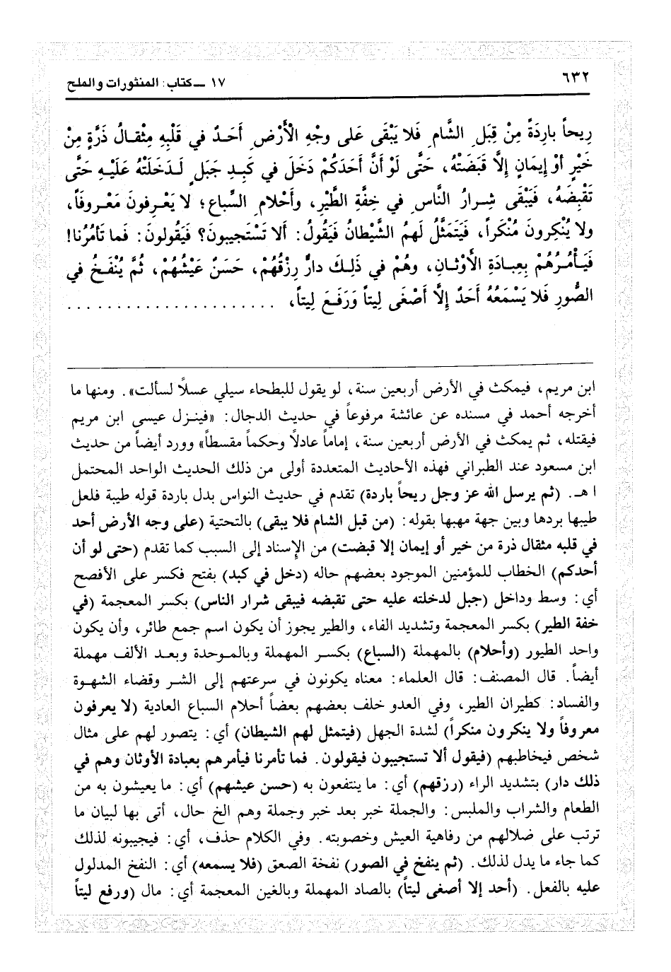 ريحاً بَارِدَةً مِنْ قِبَلِ الشَّامِ، فَلاَ يَبْقَى عَلَى وَجْهِ الأَرْضِ أَحَدٌ فِي قَلْبِهِ مِثْقَالُ ذَرَّةٍ مِنْ خَيرٍ أو إيمَانٍ إلاَّ قَبَضَتْهُ، حَتَّى لو أنَّ أَحَدَكُمْ دَخَلَ فِي كَبِدِ جَبَلٍ، لَدَخَلَتْهُ عَلَيهِ حَتَّى تَقْبِضَهُ، فَيَبْقَى شِرَارُ النَّاسِ في خِفَّةِ الطَّيْرِ، وأحْلامِ السِّبَاعِ، لاَ يَعْرِفُونَ مَعْرُوفاً، ولا يُنْكِرُونَ مُنْكَراً، فَيَتَمَثَّلُ لَهُمُ الشَّيْطَانُ، فيَقُولُ: ألاَ تَسْتَجِيبُونَ؟ فَيَقُولُونَ: فَمَا تأمُرُنَا! فَيَأمُرُهُمْ بِعِبَادَةِ الأوْثَانِ، وَهُمْ في ذلِكَ دَارٌّ رِزْقُهُمْ، حَسَنٌ عَيشُهُمْ، ثُمَّ يُنْفَخُ في الصُّورِ، فَلاَ يَسْمَعُهُ أحَدٌ إلاَّ أصْغَى لِيتاً وَرَفَعَ لِيتاً،