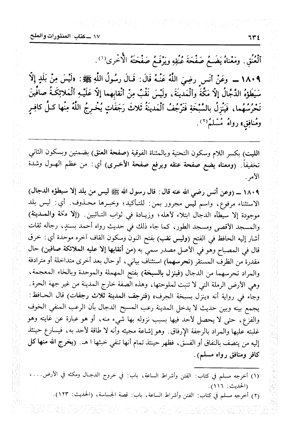 1809- وعن أنس - رضي الله عنه - قال: قال رسول الله - صلى الله عليه وسلم -: "لَيسَ مِنْ بَلَدٍ إلاَّ سَيَطَؤُهُ الدَّجَّالُ إلاَّ مَكَّةَ وَالمَدِينَةَ؛ وَلَيْسَ نَقْبٌ مِنْ أنْقَابِهِمَا إلاَّ عَلَيْهِ المَلاَئِكَةُ صَافِّينَ تَحْرُسُهُمَا، فَيَنْزِلُ بالسَّبَخَةِ، فَتَرْجُفُ المَدِينَةُ ثَلاَثَ رَجَفَاتٍ، يُخْرِجُ اللهُ مِنْهَا كُلَّ كافِرٍ وَمُنَافِقٍ". رواه مسلم (¬2) .