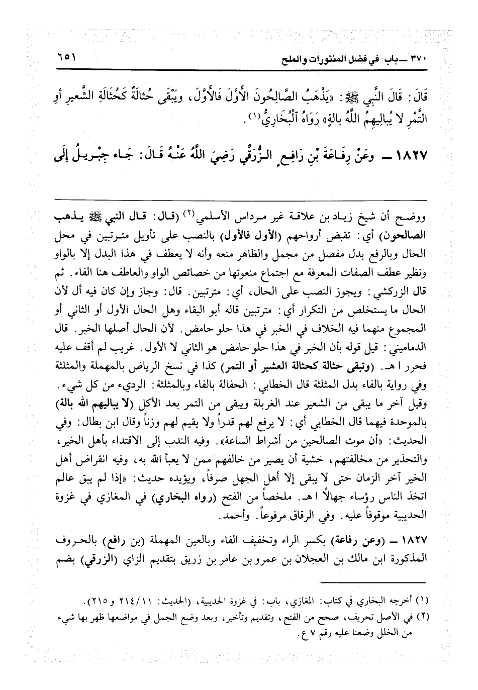 1827- (وعن رفاعة) بكسر الراء وتخفيف الفاء وبالعين المهملة (بن رافع) بالحروف المذكورة ابن مالك بن العجلان بن عمرو بن عامر بن زريق بتقديم الزاي (الزرقي) بضم
