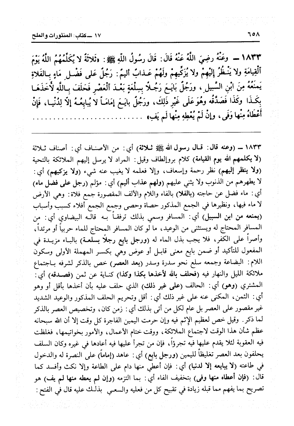 1833- وعنه، قال: قال رسول الله - صلى الله عليه وسلم -: "ثَلاَثَةٌ لاَ يُكَلِّمُهُمُ اللهُ يَومَ القِيَامَةِ، وَلاَ يَنْظُرُ إلَيْهِمْ، وَلاَ يُزَكِّيهِمْ، وَلَهُمْ عَذَابٌ ألِيمٌ: رَجُلٌ عَلَى فَضْلِ مَاءٍ بِالفَلاَةِ يَمْنَعُهُ مِنِ ابْنِ السَّبِيلِ، وَرَجُلٌ بَايَعَ رَجُلاً سِلْعَةً بَعْدَ العَصْرِ فَحَلَفَ بِاللهِ لأَخَذَهَا بِكذَا وَكَذَا فَصَدَّقَهُ وَهُوَ عَلَى غَيْرِ ذلِكَ، وَرَجُلٌ بَايَعَ إمَاماً لاَ يُبَايِعُهُ إلاَّ لِدُنْيَا فَإنْ أَعْطَاهُ مِنْهَا وَفَى وَإنْ لَمْ يُعْطِهِ مِنْهَا لَمْ يَفِ"