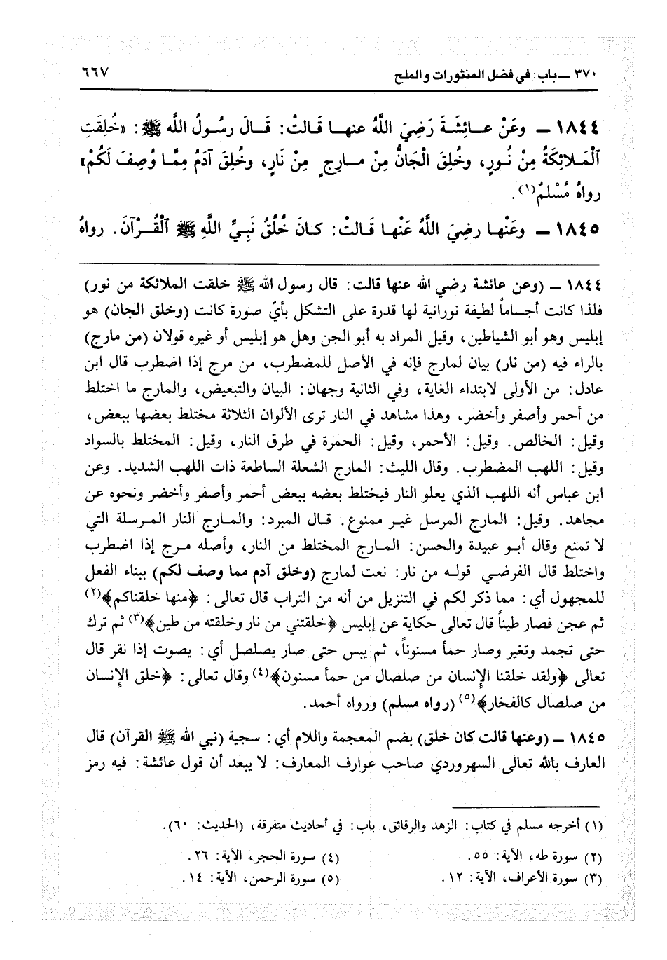 1844- وعن عائشة رضي الله عنها، قالت: قال رسولُ اللهِ - صلى الله عليه وسلم -: "خُلِقَتِ المَلاَئِكَةُ مِنْ نُورٍ، وَخُلِقَ الجَانُّ مِنْ مَارِجٍ من نَارٍ، وَخُلِقَ آدَمُ مِمَّا وُصِفَ لَكُمْ". رواه مسلم (¬1) .