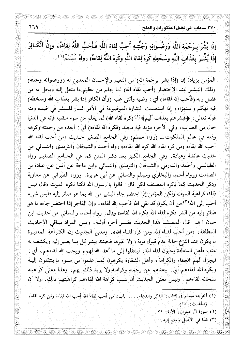(¬1) أخرجه مسلم في كتاب: الذكر والدعاء ... ، باب: من أحب لقاء الله أحب الله لقاءه ومن كره لقاء، (الحديث: 15) .