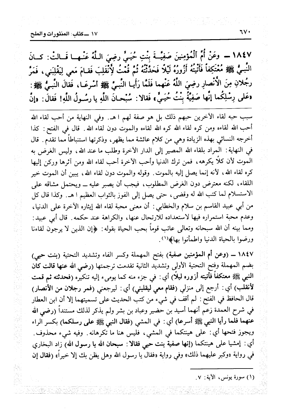 1847- وَعَنْ أُمِّ المُؤْمِنِينَ صَفِيَّةَ بنتِ حُيَيٍّ رَضيَ اللهُ عَنها، قالتْ: كان النبيُّ - صلى الله عليه وسلم - مُعْتَكِفاً، فَأَتَيْتُهُ أزُورُهُ لَيْلاً، فَحَدَّثْتُهُ ثُمَّ قُمْتُ لأَنْقَلِبَ فَقَامَ مَعِي لِيَقْلِبَنِي، فَمَرَّ رَجُلاَنِ مِنَ الأنْصَارِ رضيَ اللهُ عَنهُما، فَلَمَّا رَأَيَا النَّبيَّ - صلى الله عليه وسلم - أسْرَعَا. فقال - صلى الله عليه وسلم -: "عَلَى رِسْلِكُمَا، إنَّهَا صَفِيَّةُ بِنْتُ حُيَيٍّ" فَقَالاَ: سُبْحانَ اللهِ يَا رسولَ اللهِ، فقالَ: "إنَّ