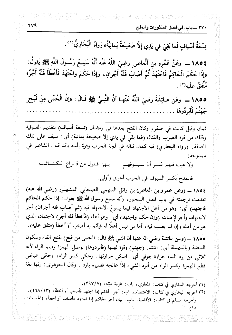 1854- (وعن عمرو بن العاص) بن وائل السهمي الصحابي المشهور (رضي الله عنه) تقدمت ترجمته في باب فضل السحور، (أنه سمع رسول الله - صلى الله عليه وسلم - يقول: إذا حكم الحاكم فاجتهد) أي: وهو من أهل الاجتهاد فيما يسوغ الاجتهاد فيه (ثم أصاب فله أجران) أجر لاجتهاده وأجر لإِصابته (وإن حكم واجتهد) أي: وهو أهله (فأخطأ فله أجر) لاجتهاده الذي هو من أهله وإن لم يصب فيه، أما من ليس أهلاً له فيأثم به أصاب أو أخطأ (متفق عليه) .