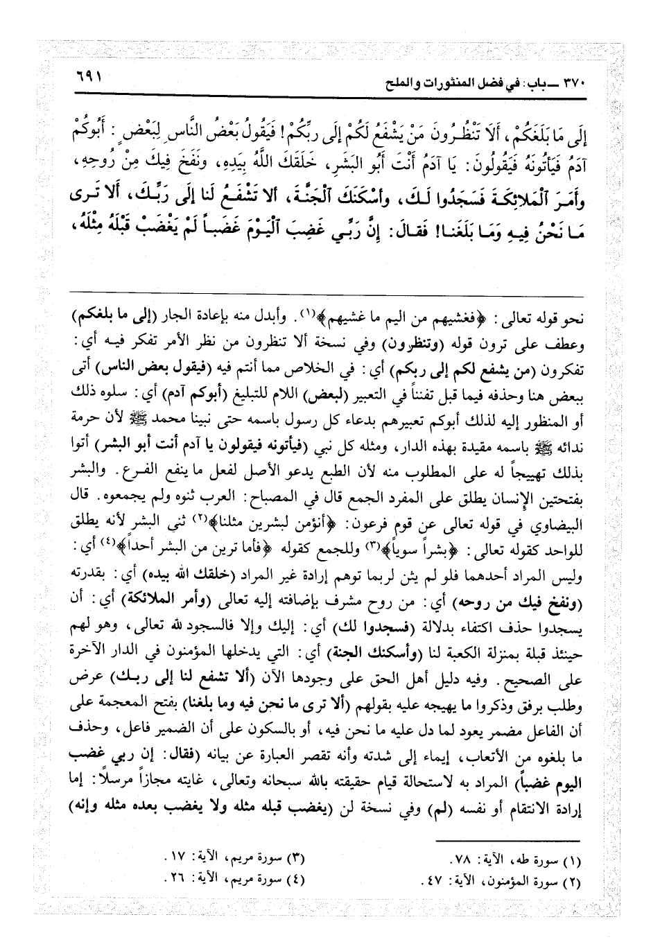 إِلَى مَا بَلَغَكُمْ، ألاَ تَنْظُرُونَ مَنْ يَشْفَعُ لَكُمْ إِلَى رَبِّكُمْ؟ فَيقُولُ بَعْضُ النَّاسِ لِبَعْضٍ: أبُوكُمْ آدَمُ، فَيَأتُونَهُ فَيقُولُونَ: يَا آدَمُ أنْتَ أَبُو البَشَرِ، خَلَقَكَ اللهُ بِيَدِهِ، وَنَفَخَ فِيكَ مِنْ رُوحِهِ، وأمَرَ المَلاَئِكَةَ فَسَجَدُوا لَكَ، وأسْكَنَكَ الجَنَّةَ، ألاَ تَشْفَعُ لَنَا إِلَى رَبِّكَ؟ ألاَ تَرَى إِلَى مَا نَحْنُ فِيهِ وَمَا بَلَغْنَا؟ فَقَالَ: إنَّ رَبِّي غَضِبَ اليَوْمَ غَضَباً لَمْ يَغْضَبْ قَبْلَهُ مِثْلَهُ،