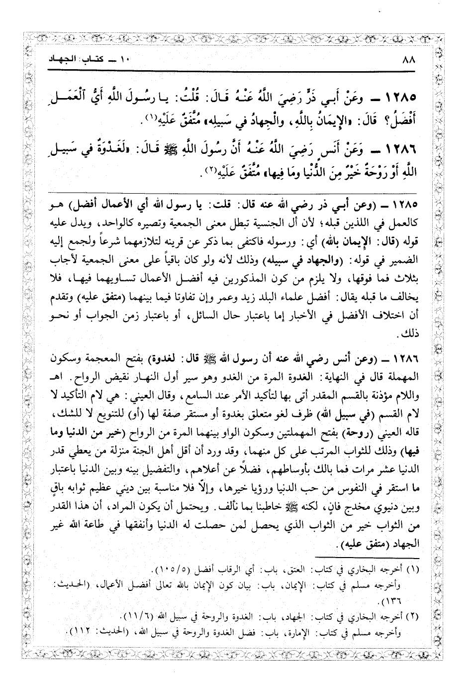 1286- وعن أنس - رضي الله عنه -: أنَّ رسول الله - صلى الله عليه وسلم -، قَالَ: "لَغَدْوَةٌ في سَبيلِ اللهِ، أَوْ رَوْحَةٌ، خَيْرٌ مِنَ الدُّنْيَا وَمَا فِيهَا" متفقٌ عَلَيْهِ (¬2) .