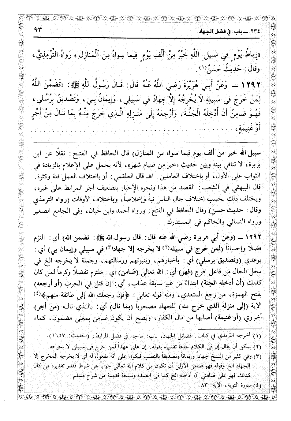 1292- (وعن أبي هريرة رضي الله عنه قال: قال رسول الله - صلى الله عليه وسلم - تضمن الله) أي: التزم فضلا وإحساناً (لمن خرج في سبيله (¬2) لا يخرجه إلا جهاد (¬3) في سبيلي وإيمان بي) أي: بوعدي (وتصديق برسلي) أي: بأخبارهم، وبنبوتهم ورسالتهم، وجملة لا يخرجه الخ في محل الحال من فاعل خرج (فهو) أي: الله تعالى (ضامن) أي ملتزم تفضلاً وكرماً لمن كان كذلك (أن أدخله الجنة) ابتداءً من غير سابقة عذاب، أي: إن قتل في الحرب (أو أرجعه) بفتح الهمزة، من رجع المتعدي، ومنه قوله تعالي: (فإن رجعك الله إلى طائفة منهم) (¬4) الآية (إلى منزله الذي خرج منه) للجهاد مصحوباً (بما نال) أي: بالذي ناله (من أجر) أخروي (أو غنيمه) أصابها من مال الكفار، ويصح أن يكون ضامن بمعنى مضمون، كماء