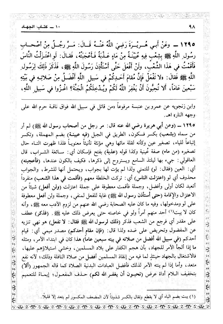 1295- وعن أَبي هريرة - رضي الله عنه -، قَالَ: مَرَّ رَجُلٌ مِنْ أصْحَابِ رسولِ الله - صلى الله عليه وسلم - بِشِعبٍ فِيهِ عُيَيْنَةٌ مِنْ مَاءٍ عَذْبَة، فَأعْجَبَتْهُ، فَقَالَ: لَو اعْتَزَلْتُ النَّاسَ فَأقَمْتُ في هَذَا الشِّعْبِ، وَلَنْ أفْعَلَ حَتَّى أسْتَأْذِنَ رسولَ اللهِ - صلى الله عليه وسلم -، فذكَرَ ذَلِكَ لرسول الله - صلى الله عليه وسلم -، فَقَالَ: "لاَ تَفعلْ؛ فَإنَّ مُقامَ أَحَدِكُمْ في سَبيلِ اللهِ أفْضَلُ مِنْ صَلاَتِهِ في بَيْتِهِ سَبْعِينَ عَاماً، أَلاَ تُحِبُّونَ أنْ يَغْفِرَ الله لَكُمْ، وَيُدْخِلَكُمُ الجَنَّةَ؟ أُغْزُوا في سَبيلِ الله،