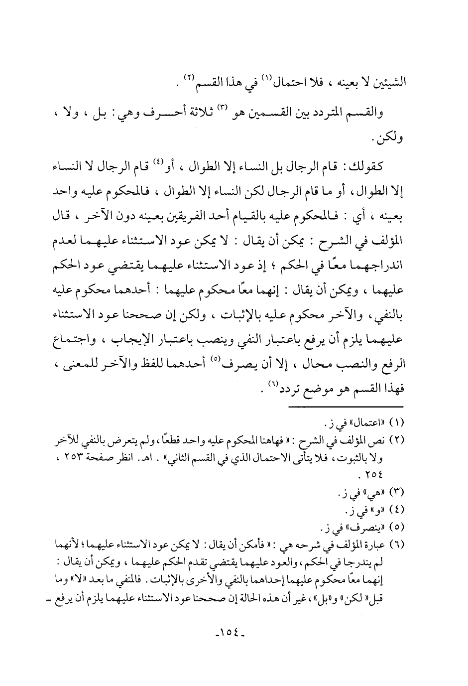 (٦) عبارة المؤلف في شرحه هي: "فأمكن أن يقال: لا يمكن عود الاستثناء عليهما؛ لأنهما لم يندرجا في الحكم، والعود عليهما يقتضي تقدم الحكم عليهما، ويمكن أن يقال: إنهما معًا محكوم عليهما إحداهما بالنفي والأخرى بالإثبات. فالمنفي ما بعد "لا" وما قبل "لكن" و"بل"، غير أن هذه الحالة إن صححنا عود الاستثناء عليهما يلزم أن يرفع =