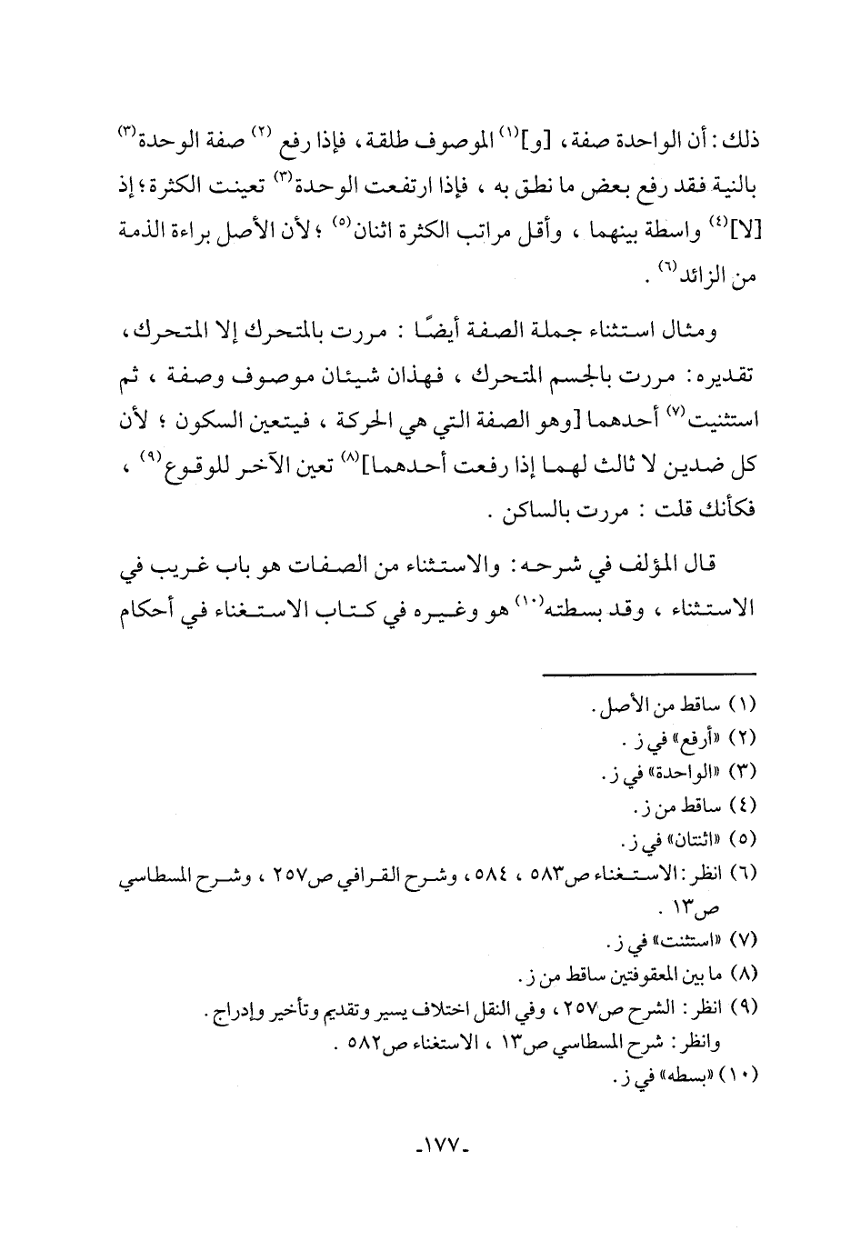 قال المؤلف في شرحه: والاستثناء من الصفات هو باب غريب في الاستثناء، وقد بسطته (١٠) هو وغيره في كتاب الاستغناء في أحكام