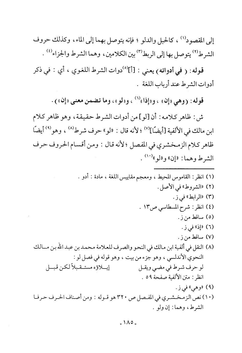 (١٠) نص الزمخشري في المفصل ص ٣٢٠ هو قوله: ومن أصناف الحرف حرفا الشرط، وهما: إن ولو.