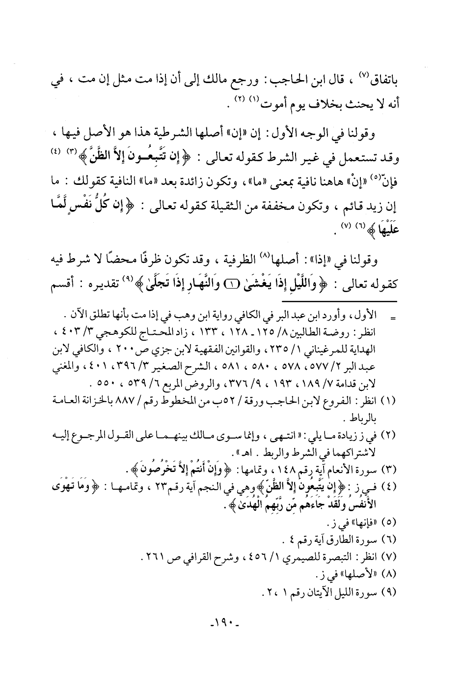 وقولنا في الوجه الأول: إن "إن" أصلها الشرطية هذا هو الأصل فيها، وقد تستعمل في غير الشرط كقوله تعالى: {إِن تَتَّبِعُونَ إلا الظَّنَّ} (٣) (٤) فإنّ (٥) "إنْ" ها هنا نافية بمعنى "ما"، وتكون زائدة بعد "ما" النافية كقولك: ما إن زيد قائم، وتكون مخففة من الثقيلة كقوله تعالى: {إِن كُلُّ نَفْسٍ لمَّا عَلَيْهَا} (٦) (٧).