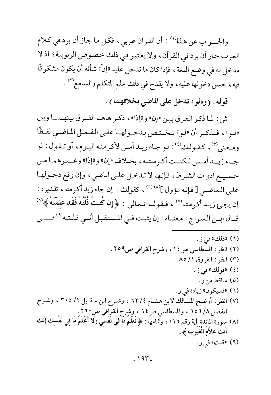ش: لما ذكر الفرق بين "إن" و"إذا"، ذكر ها هنا الفرق بينهما وبين "لو"، فذكر أن "لو" تختص بدخولها على الفعل الماضي لفظًا ومعنى (٣)، كقولك (٤): لو جاء زيد أمس لأكرمته اليوم، أو تقول: لو جاء زيد أمس لكنت أكرمته، بخلاف "إن" و"إذا" وغيرهما من جميع أدوات الشرط، فإنها لا تدخل على الماضي، وإن وقع دخولها على الماضي [فإنه مؤول] (٥) (٦)، كقولك: إن جاء زيد أكرمته، تقديره: إن يجئ زيد أكرمته (٧)، فقوله تعالى: {إِنْ كُنْتُ قُلْتُهُ فَقَدْ عَلِمْتَهُ} (٨) قال ابن السراج: معناه: إن يثبت في المستقبل أني قلته (٩) في