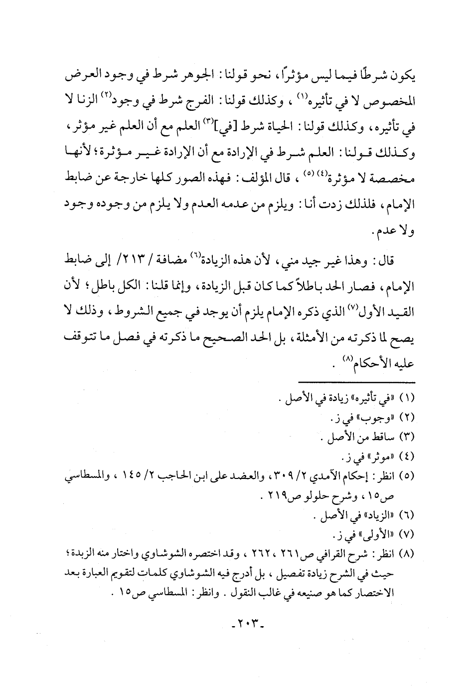 يكون شرطًا فيما ليس مؤثرًا، نحو قولنا: الجوهر شرط في وجود العرض المخصوص لا في تأثيره (١)، وكذلك قولنا: الفرج شرط في وجود (٢) الزنا لا في تأثيره، وكذلك قولنا: الحياة شرط [في] (٣) العلم مع أن العلم غير مؤثر، وكذلك قولنا: العلم شرط في الإرادة مع أن الإرادة غير مؤثرة؛ لأنها مخصصة لا مؤثرة (٤) (٥)، قال المؤلف: فهذه الصور كلها خارجة عن ضابط الإمام، فلذلك زدت أنا: ويلزم من عدمه العدم ولا يلزم من وجوده وجود ولا عدم.