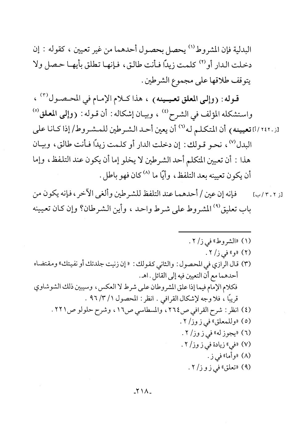 فإنه إن عين أحدهما عند التلفظ للشرطين وألغى الآخر، فإنه يكون من باب تعليق (٩) المشروط على شرط واحد، وأين الشرطان؟ وإن كان تعيينه