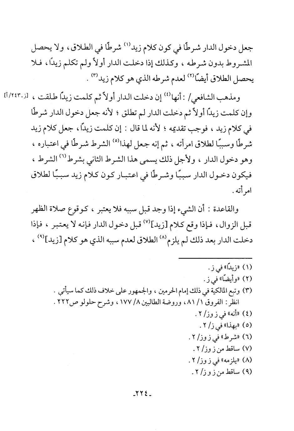 جعل دخول الدار شرطًا في كون كلام زيد (١) شرطًا في الطلاق، ولا يحصل المشروط بدون شرطه، وكذلك إذا دخلت الدار أولاً ولم تكلم زيدًا، فلا يحصل الطلاق أيضًا (٢) لعدم شرطه الذي هو كلام زيد (٣).