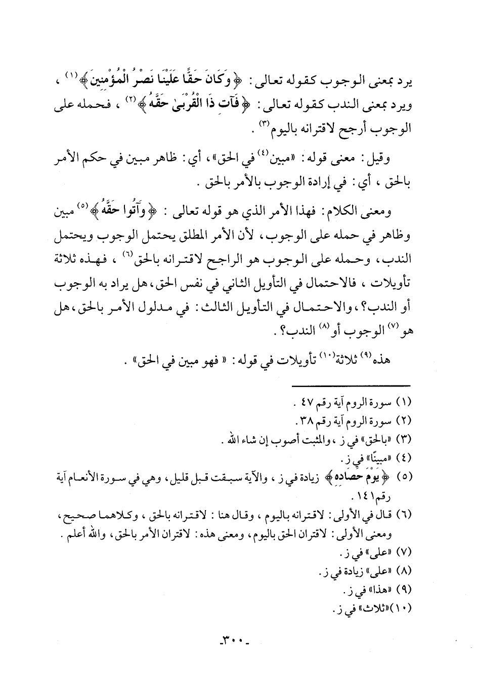 ومعنى الكلام: فهذا الأمر الذي هو قوله تعالى: {وَآتُوا حَقَّهُ} (٥) مبين وظاهر في حمله على الوجوب, لأن الأمر المطلق يحتمل الوجوب ويحتمل الندب، وحمله على الوجوب هو الراجح لاقترانه بالحق (٦)، فهذه ثلاثة تأويلات، فالاحتمال في التأويل الثاني في نفس الحق، هل يراد به الوجوب أو الندب؟، والاحتمال في التأويل الثالث: في مدلول الأمر بالحق، هل هو (٧) الوجوب أو (٨) الندب؟.