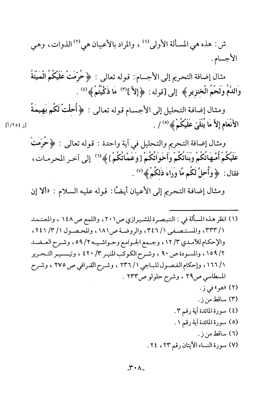 مثال إضافة التحريم إلى الأجسام: قوله تعالى: {حُرِّمَتْ عَلَيْكُمُ الْمَيْتَةُ وَالدَّمُ وَلَحْمُ الْخِنْزِيرِ} إلى [قوله: {إِلَّا] (٣) مَا ذَكَّيْتُمْ} (٤).