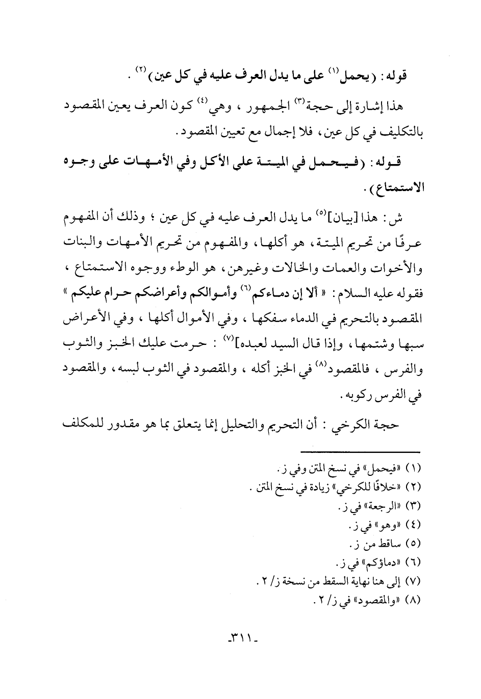 ش: هذا [بيان] (٥) ما يدل العرف عليه في كل عين؛ وذلك أن المفهوم عرفًا من تحريم الميتة، هو أكلها، والمفهوم من تحريم الأمهات والبنات والأخوات والعمات والخالات وغيرهن، هو الوطء ووجوه الاستمتاع، فقوله عليه السلام: "ألا إن دماءكم (٦) وأموالكم وأعراضكم حرام عليكم" المقصود بالتحريم في الدماء سفكها، وفي الأموال أكلها، وفي الأعراض سبها وشتمها، وإذا قال السيد لعبده] (٧): حرمت عليك الخبز والثوب والفرس، فالمقصود (٨) في الخبز أكله، والمقصود في الثوب لبسه، والمقصود في الفرس ركوبه.