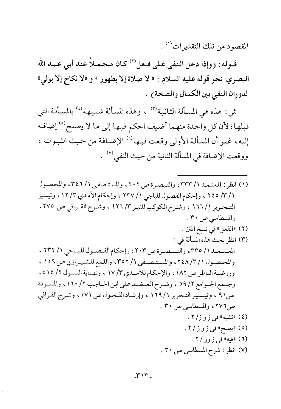 قوله: (وإِذا دخل النفي على فعل (٢) كان مجملًا عند أبي عبد الله البصري نحو قوله عليه السلام: "لا صلاة إلا بطهور" و"لا نكاح إلا بولي" لدوران النفي بين الكمال والصحة).