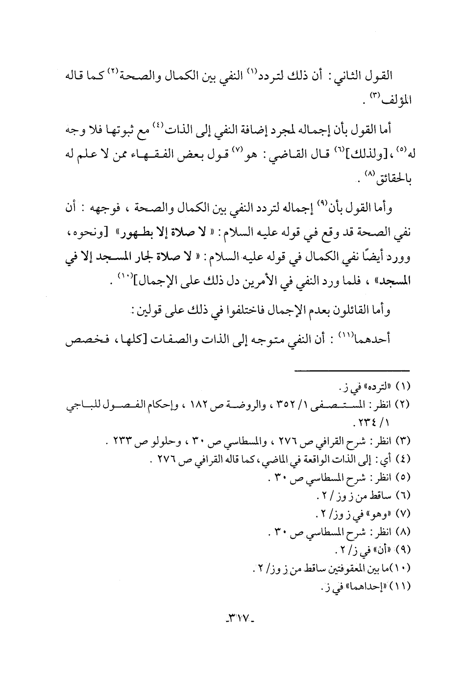 وأما القول بأن (٩) إجماله لتردد النفي بين الكمال والصحة، فوجهه: أن نفي الصحة قد وقع في قوله عليه السلام: "لا صلاة إلا بطهور" [ونحوه، وورد أيضًا نفي الكمال في قوله عليه السلام: "لا صلاة لجار المسجد إلا في المسجد"، فلما ورد النفي في الأمرين دل ذلك على الإجمال] (١٠).