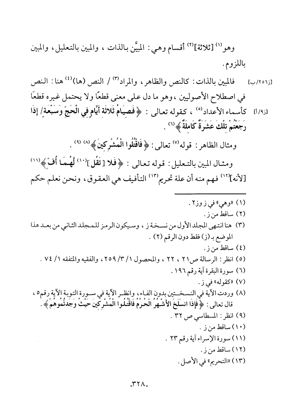 فالمبين بالذات: كالنص والظاهر، والمراد (٣) النص (ها) (٤) هنا: النص في اصطلاح الأصوليين، وهو ما دل على معنى قطعًا ولا يحتمل غيره قطعًا كأسماء الأعداد (٥)، كقوله تعالى: {فَصِيَامُ ثَلَاثَةِ أَيَّامٍ فِي الْحَجِّ وَسَبْعَةٍ إِذَا رَجَعْتُمْ تِلْكَ عَشَرَةٌ كَامِلَةٌ} (٦).