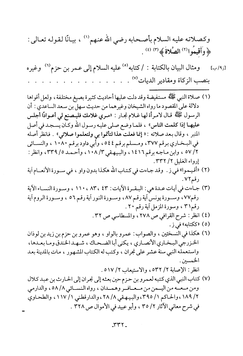 ومثال البيان بالكتابة: كتابه (٥) عليه السلام إلى عمر بن حزم (٦) وغيره بنصب الزكاة ومقادير الديات (٧) .........................................