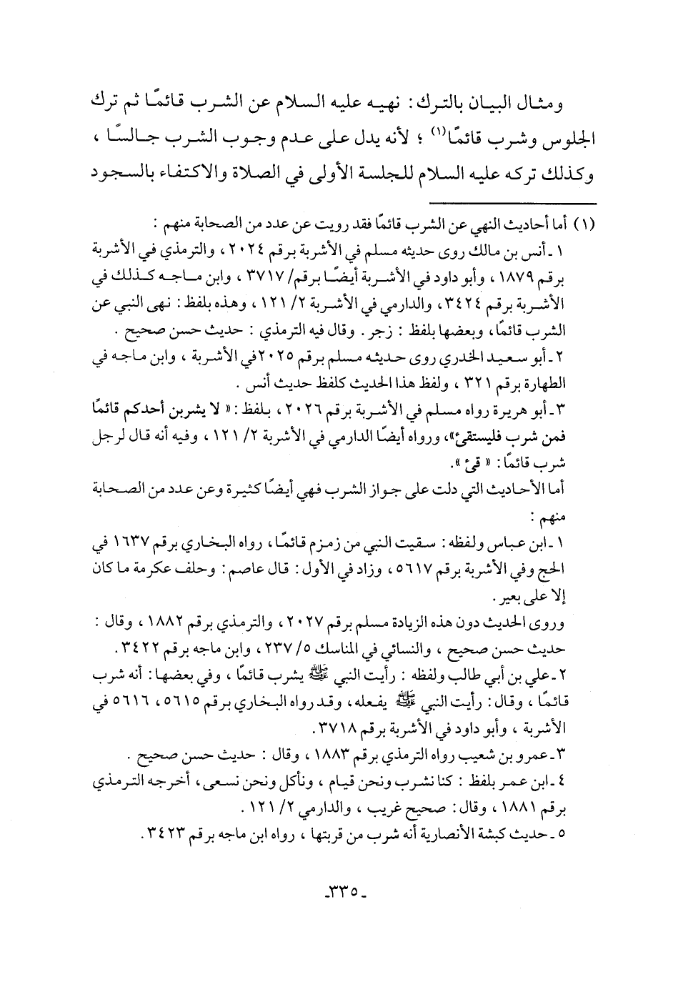 ٤ - ابن عمر بلفظ: كنا نشرب ونحن قيام، ونأكل ونحن نسعى، أخرجه الترمذي برقم ١٨٨١، وقال: صحيح غريب، والدارمي ٢/ ١٢١.