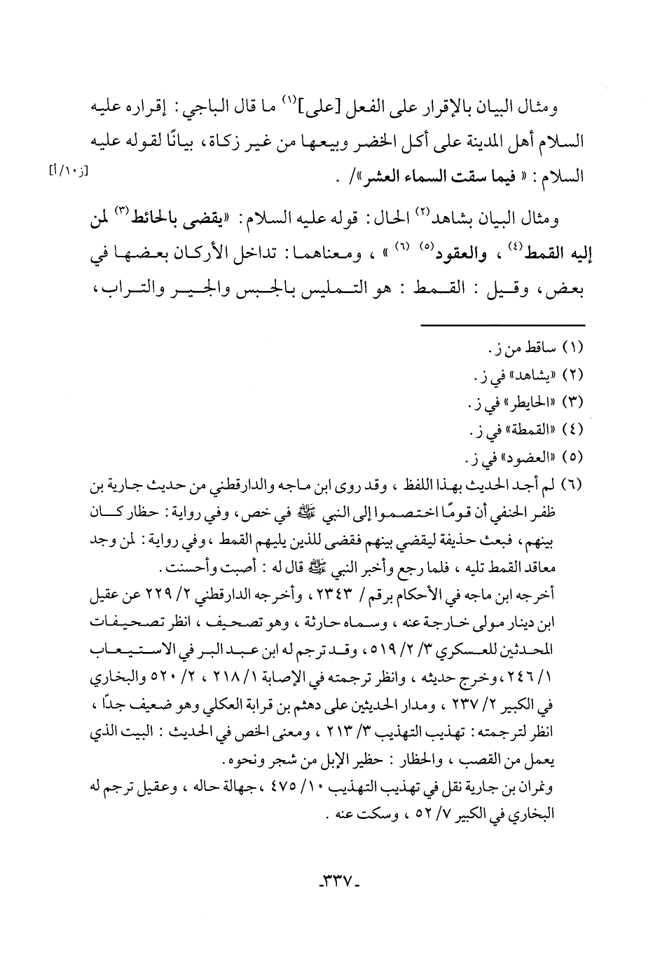 ومثال البيان بالإقرار على الفعل [على] (١) ما قال الباجي: إقراره عليه السلام أهل المدينة على أكل الخضر وبيعها من غير زكاة، بيانًا لقوله عليه السلام: "فيما سقت السماء العشر".
