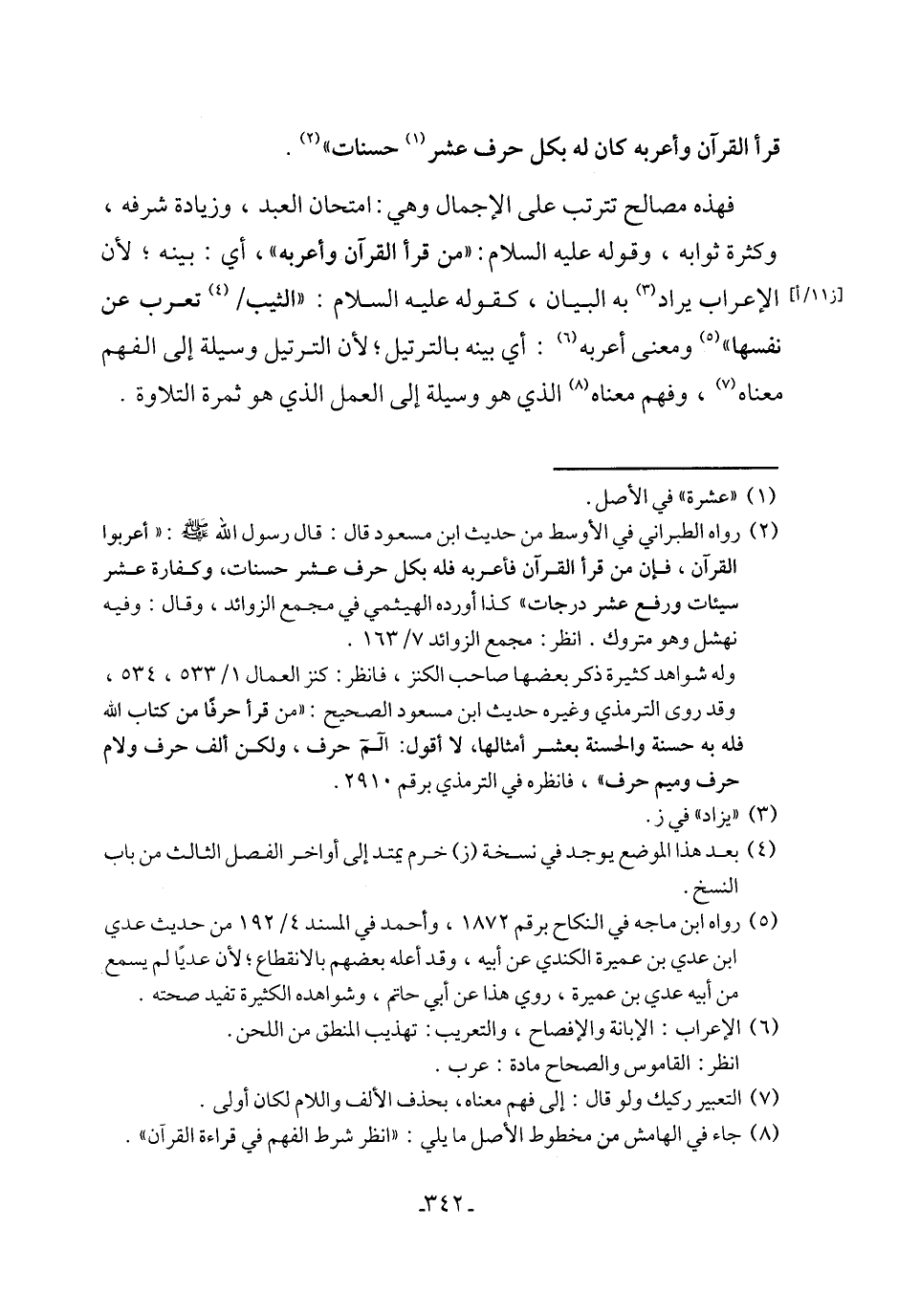 قرأ القرآن وأعربه كان له بكل حرف عشر (١) حسنات" (٢).