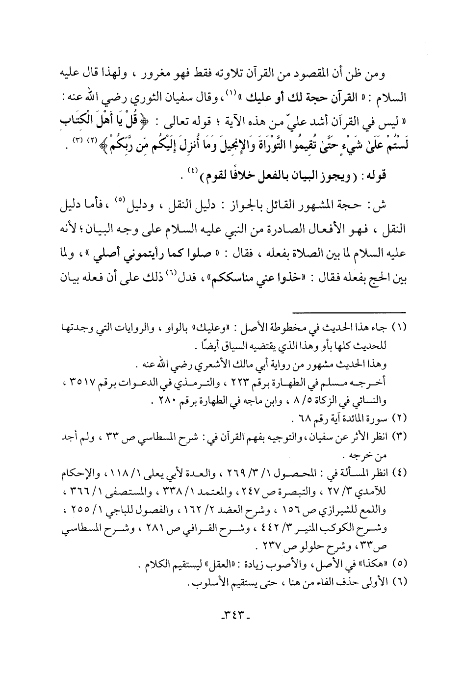 ش: حجة المشهور القائل بالجواز: دليل النقل، ودليل (٥)، فأما دليل النقل، فهو الأفعال الصادرة من النبي عليه السلام على وجه البيان؛ لأنه عليه السلام لما بين الصلاة بفعله، فقال: "صلوا كما رأيتموني أصلي"، ولما بين الحج بفعله فقال: "خذوا عني مناسككم"، فدل (٦) ذلك على أن فعله بيان