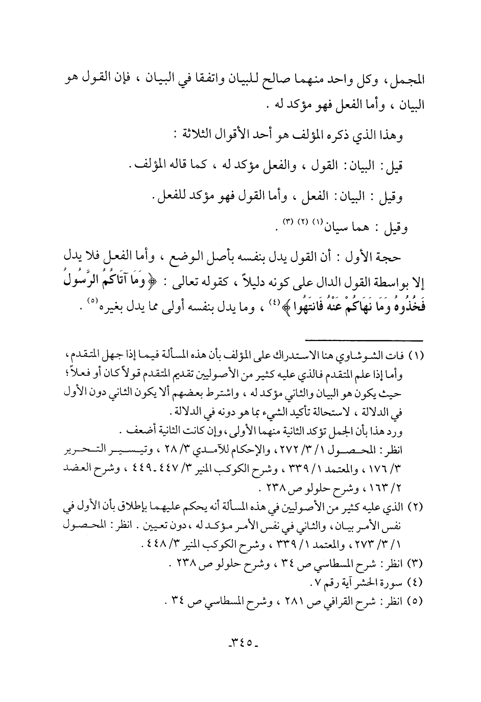 حجة الأول: أن القول يدل بنفسه بأصل الوضع، وأما الفعل فلا يدل إلا بواسطة القول الدال على كونه دليلًا، كقوله تعالى: {وَمَا آتَاكُمُ الرَّسُولُ فَخُذُوهُ وَمَا نَهَاكُمْ عَنْهُ فَانْتَهُوا} (٤)، وما يدل بنفسه أولى مما يدل بغيره (٥).